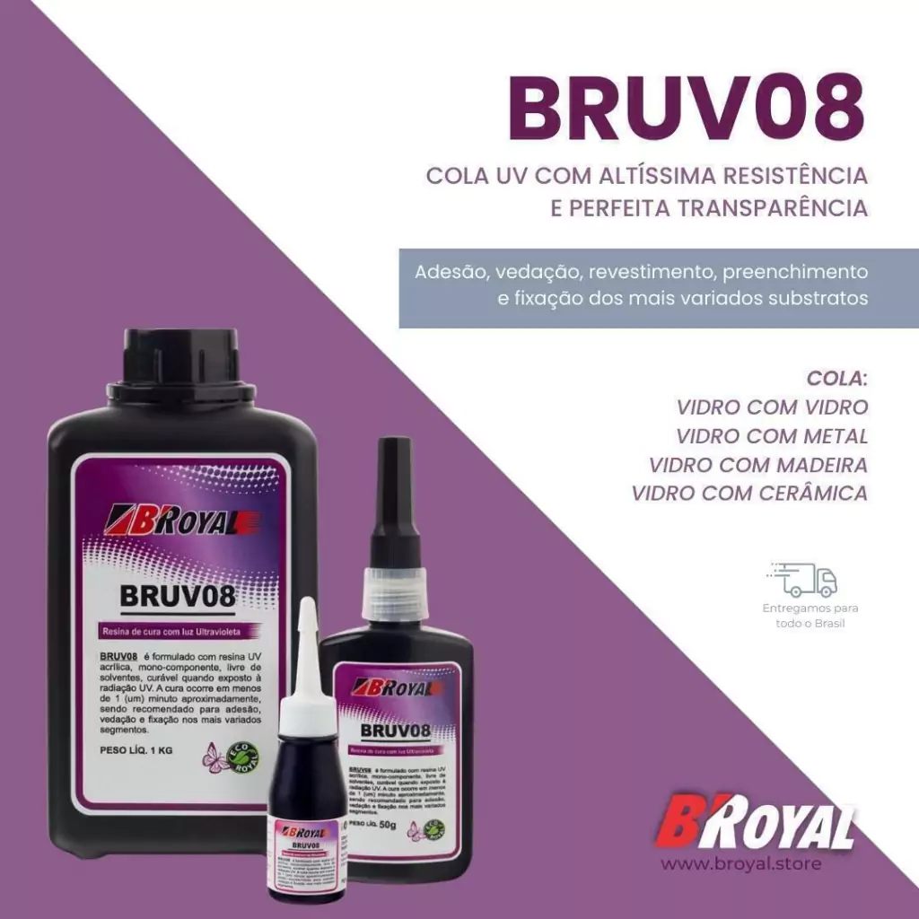 O Adesivo BRUV08 da BRoyal é uma cola UV com altíssima resistência e perfeita transparência, com boa resistência térmica e também oferecendo proteção anticorrosiva.